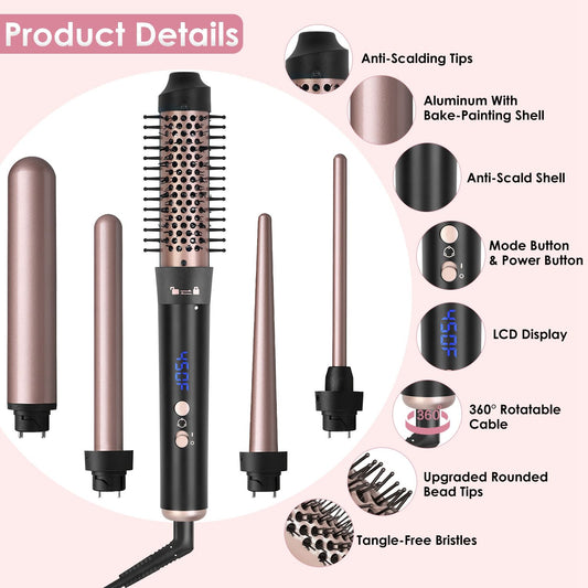 5 in 1 Curling Wand Hair Curling Iron Normal Type Brush Anti-Tangle Hair Thermal Brush Curler with 4 Heating Levels 360° Rotatable Cable 5 Interchangeable Barrels 2 Clips 1H Auto Off